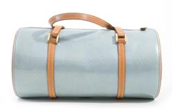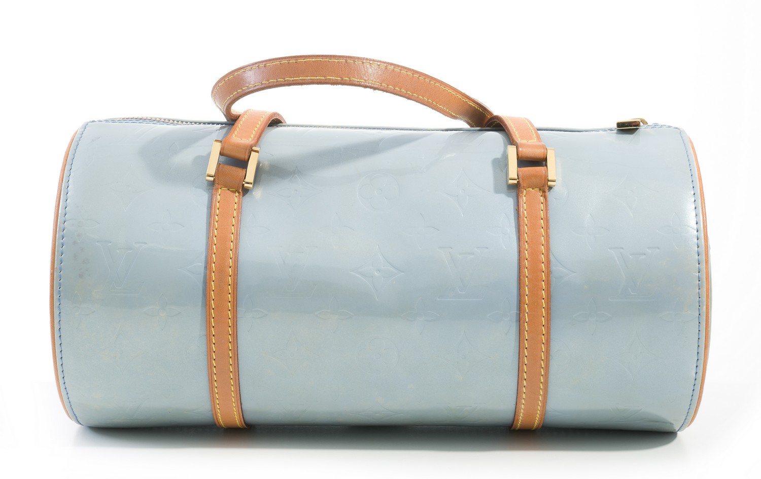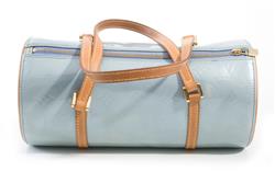Styled in grey vernis leather with tan leather trim and gold metal hardware, M91130, 30 x 15cm