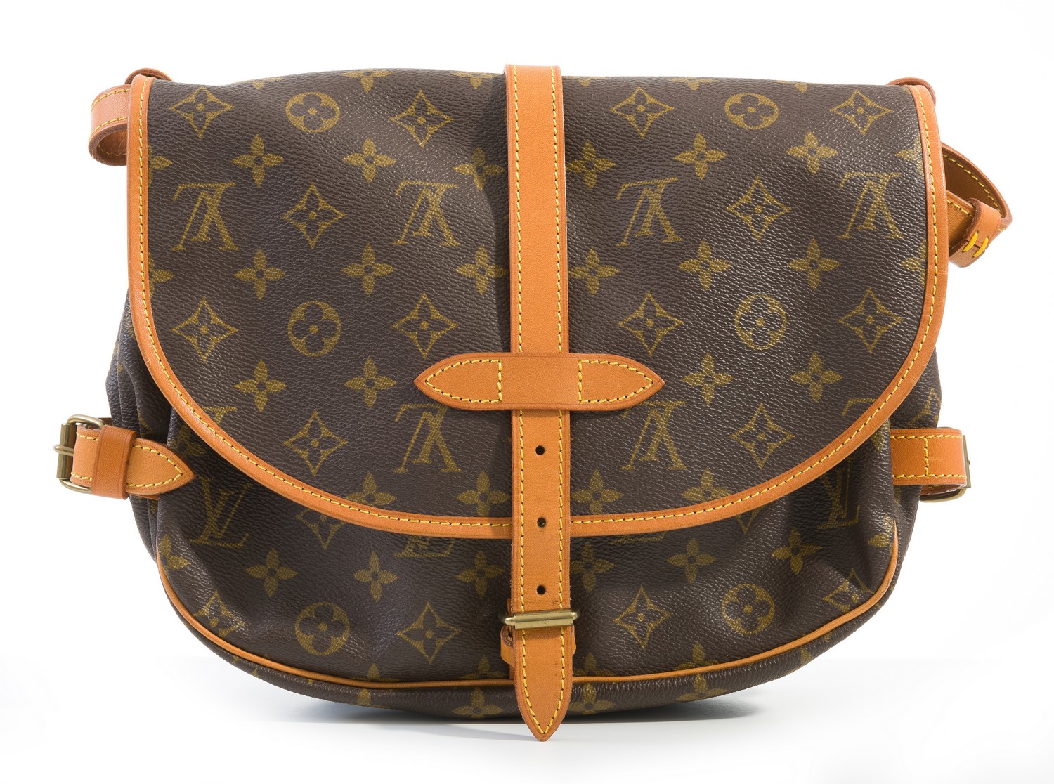 Styled in monogram canvas with tan leather trim and gold metal hardware, M42256, 20 x 30 x 7cm.