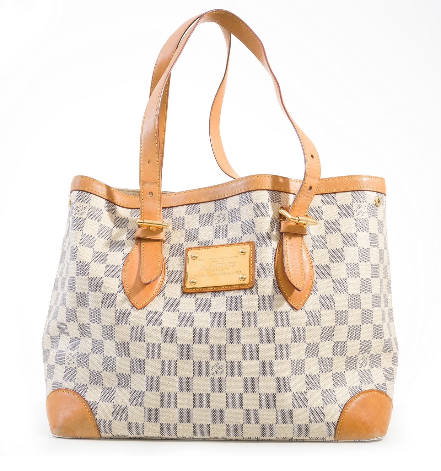 Styled in Damier Azur, with tan leather trim and gold metal hardware, 28 x 48 x 17cm.