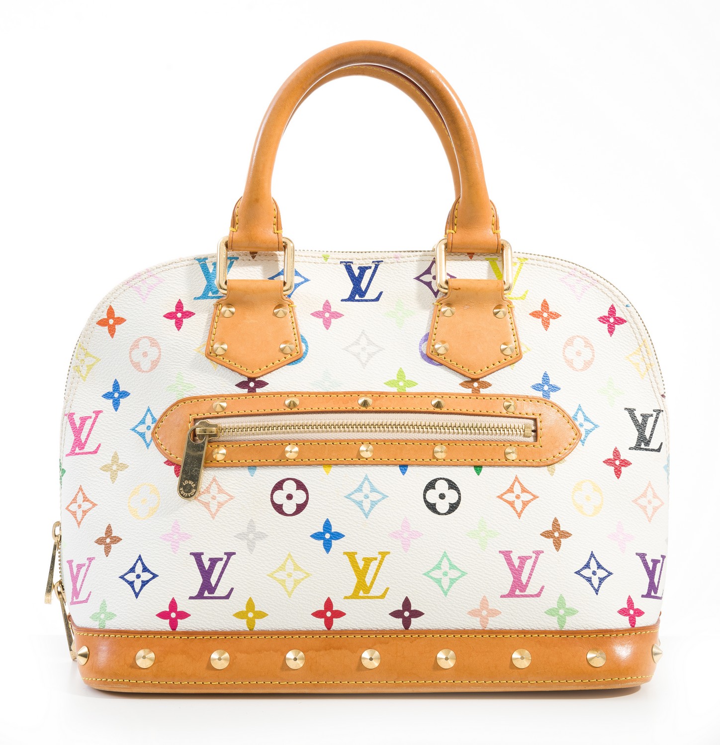 Styled in multicolore canvas with tan leather trim and gold metal hardware, 24 x 36 x 15.5cm.