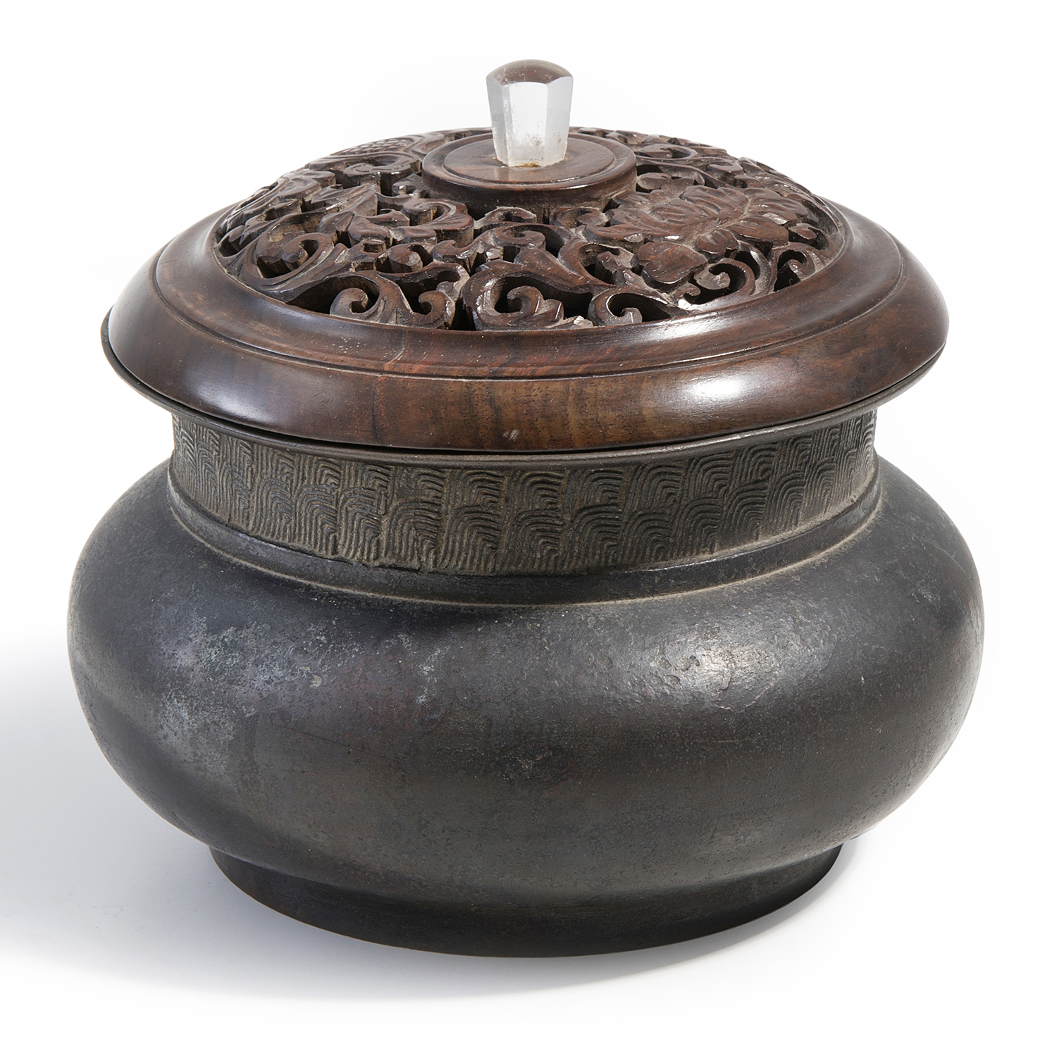 Of squat form, the patinated bronze censer featuring an archaistic wave pattern on the shoulder and neck with carved wooden cover of scrolling grasses and faceted rock crystal finial