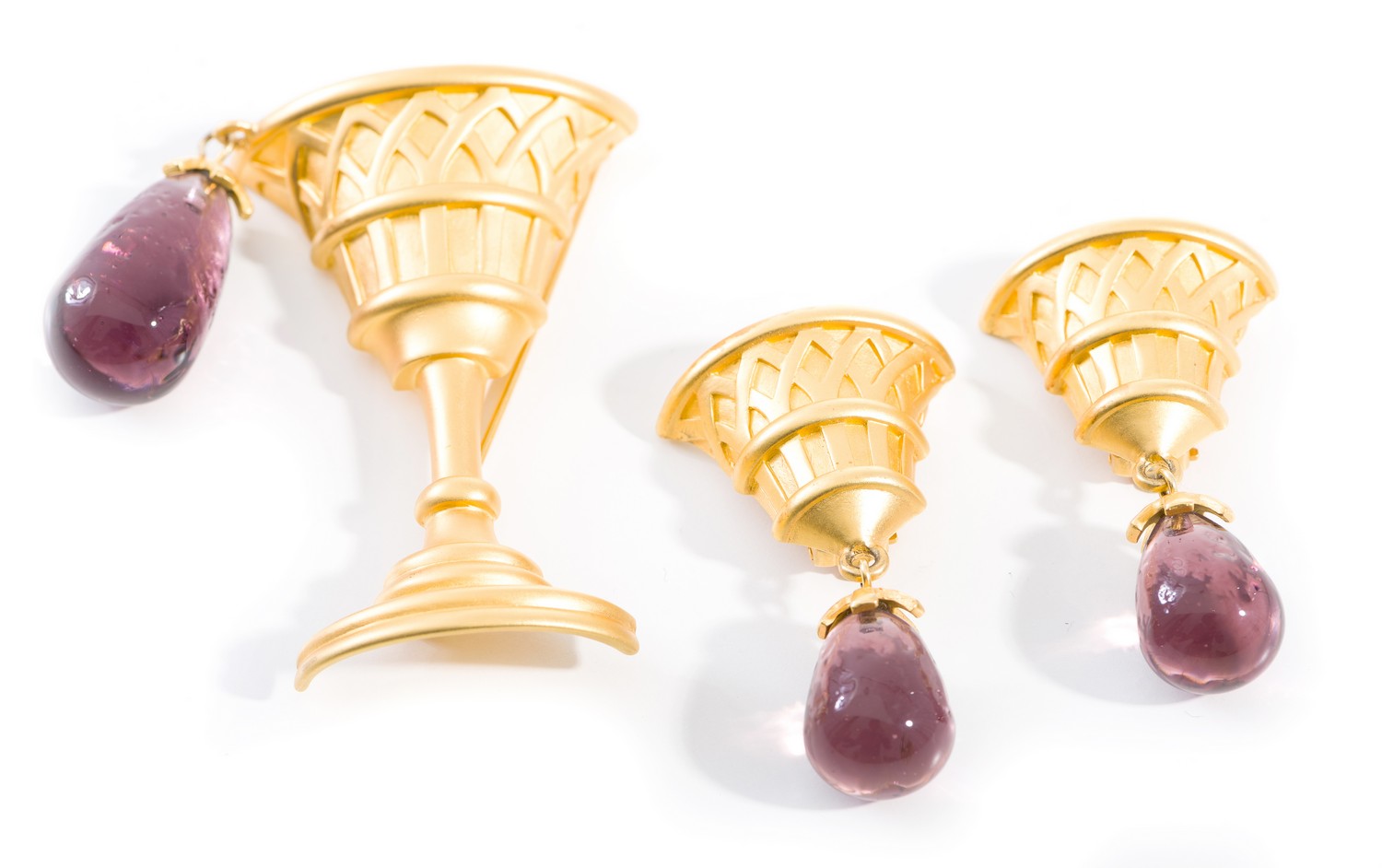 Comprising brooch and earrings, each styled as a goblet in gold metal with a drop of wine, earrings to clip fittings.