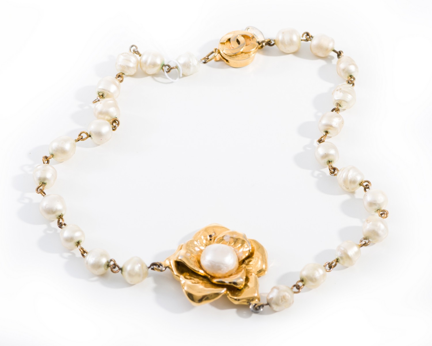 Styled with faux pearls in gold metal, with CC clasp, boxed