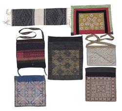 One panel of three colour batik with curvilinear and geometric designs in red, blue and yellow. Another panel with supplementary weft brocade geometric designs set in beaten indigo surround. Another panel with intricate multicolour floral embroidery. Two panels with intricate crosstitch geometric designs. A complete apron with supplimentary weft brocade geometric bands of decoration. Another apron of batik indigo, and the last of supplimentary weft brocade, geometric designs.