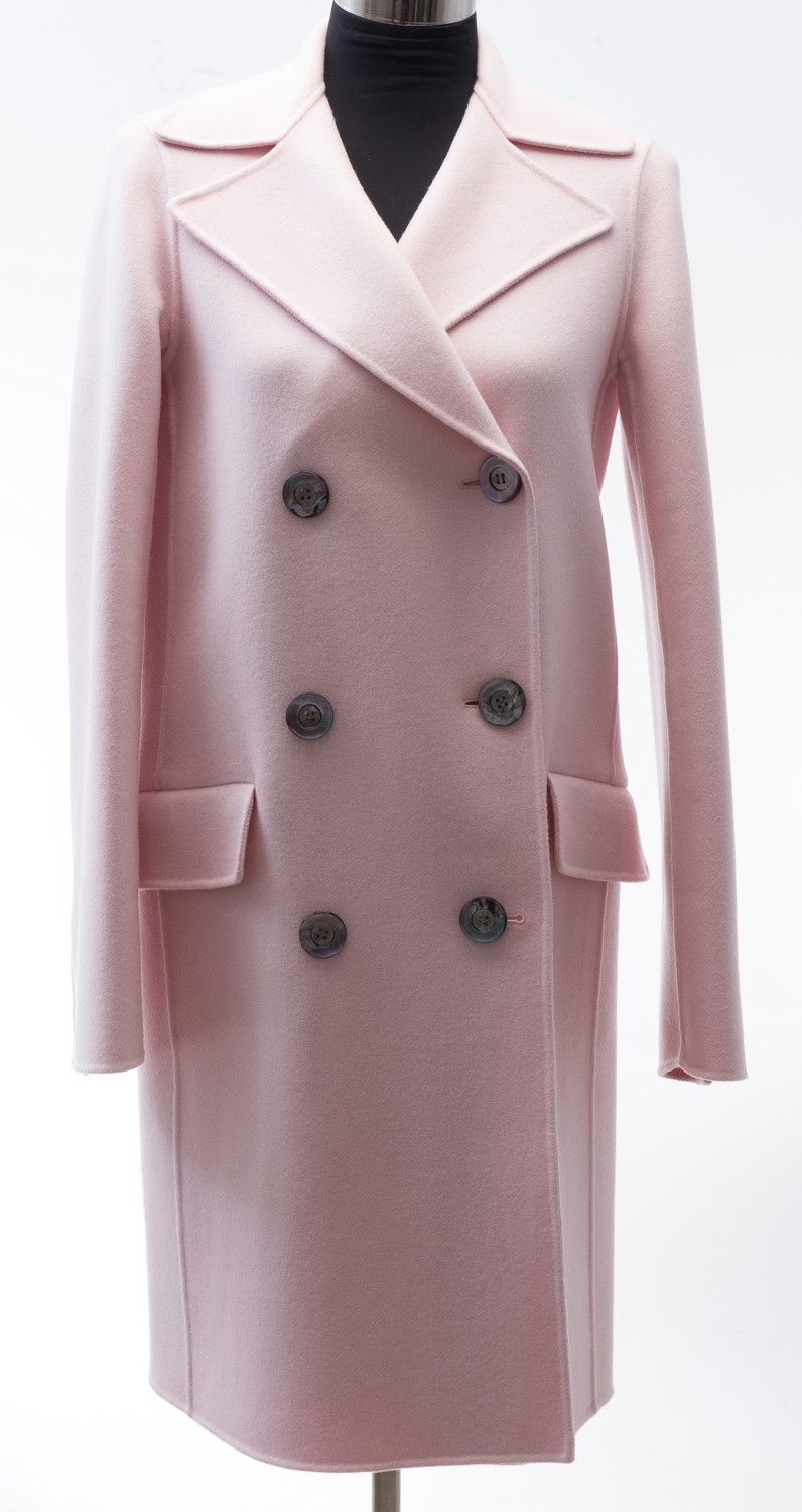 Styled in rose pink cashmere with mother of pearl buttons, labelled size 38.