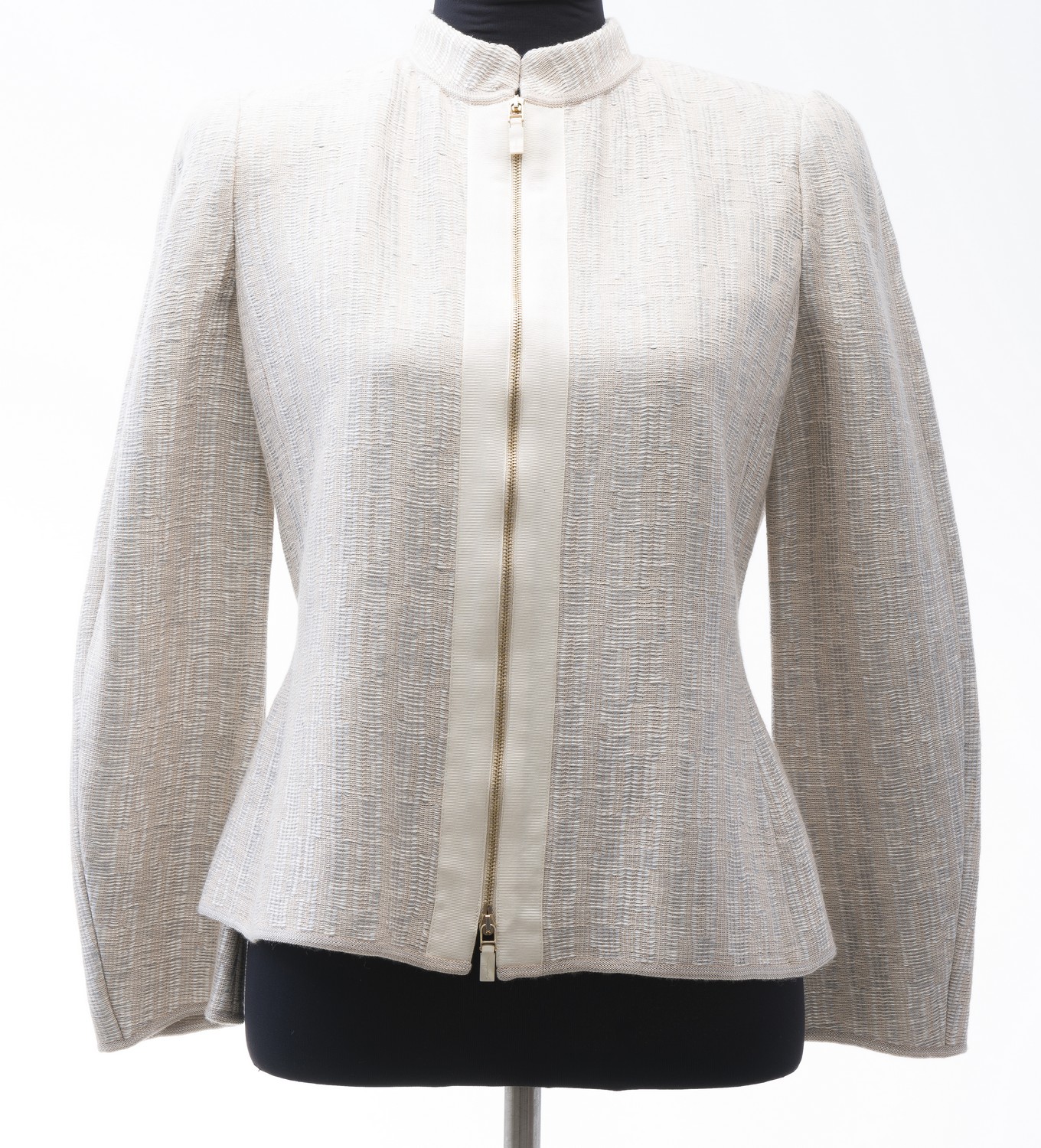 Styled in cream woven silk/cashmere blend, labeled size US42