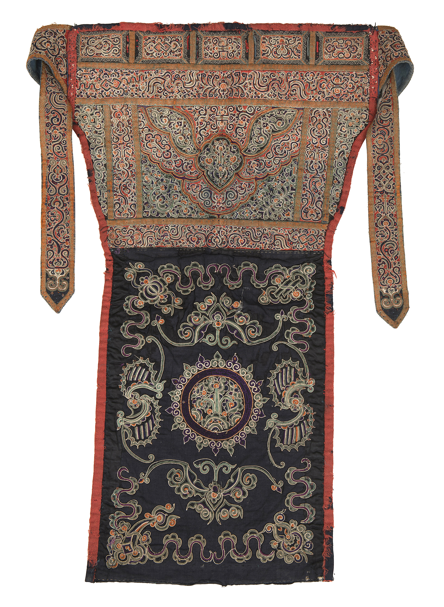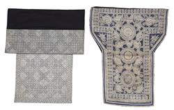 Comprising of three baby carriers, one of heavy structure, with a complex design made up of embroidered applique work, the embroidery in silk, cotton and metal-wrapped thread, decorated with reserves of scrolling flowers including lotus, bordered with weft-brocade ribbon. Another baby carrier with complex white geometric white cotton embroidery on an indigo ground. The final baby carrier of indigo batik decorated with stylised scrolling floral motifs.
