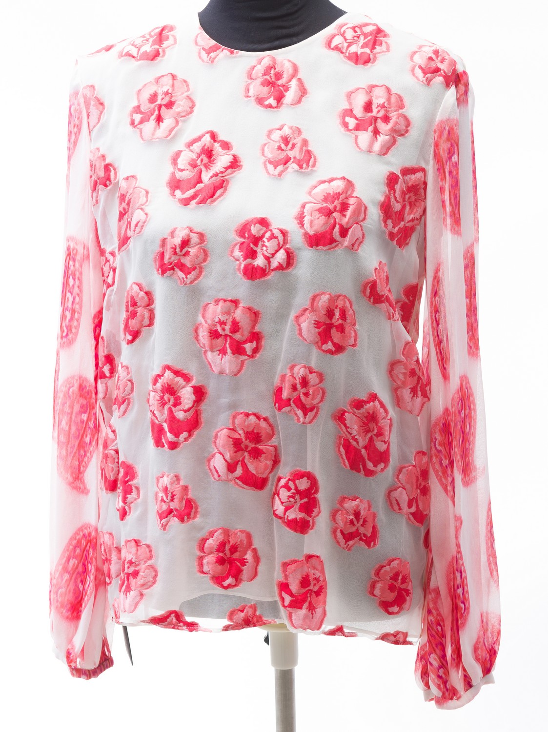 Styled in white silk blend chiffon with red floral motif, labelled size 44/M.