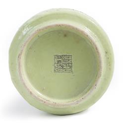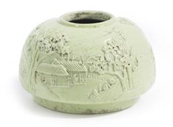 The water coupe of beehive form, decorated with an intricate scene of a figure in a pavillion amidst mountains and trees in relief carving and applique work, covered all over with a rich lime green enamel, the base with a relief carved four character mark for Wang Binrong.