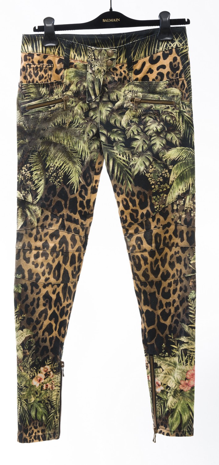 Styled in tropical print stretch denim, size 38.