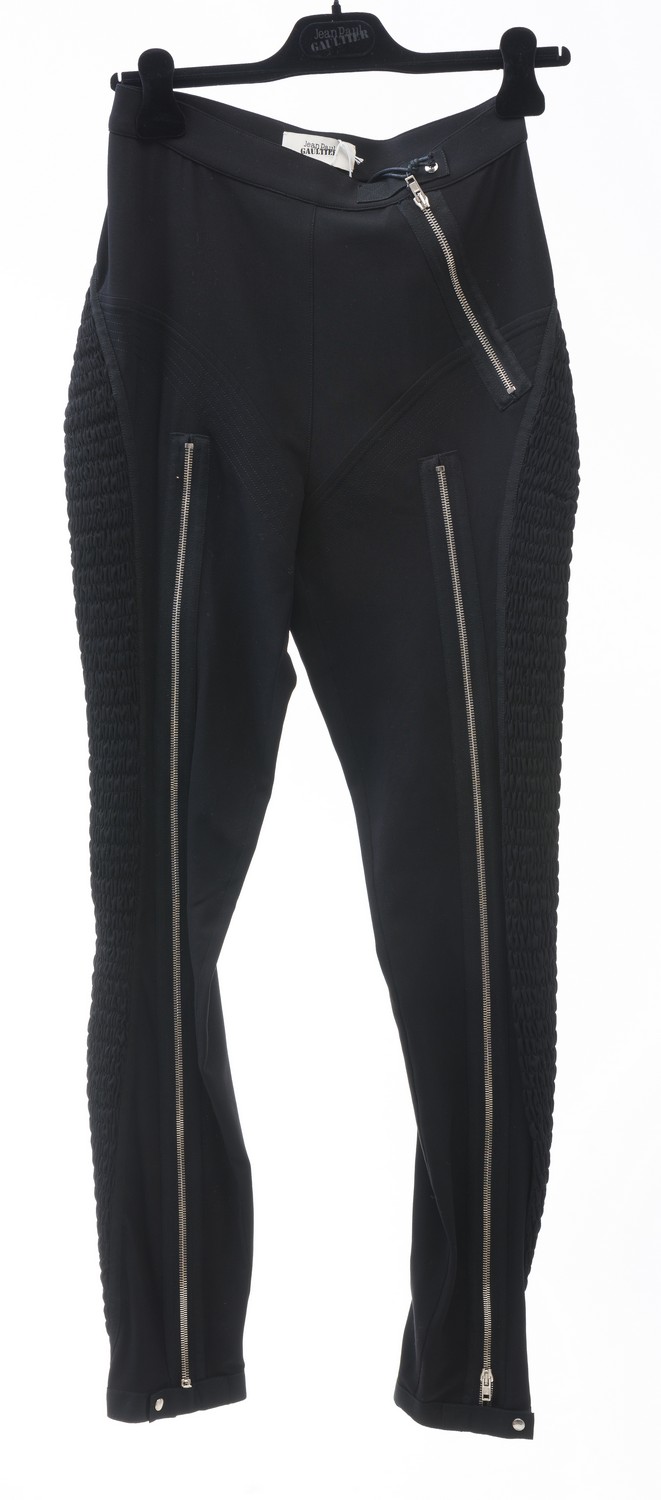 Styled in black stretch wool with ruched accents and silver metal zips, labelled size 40.