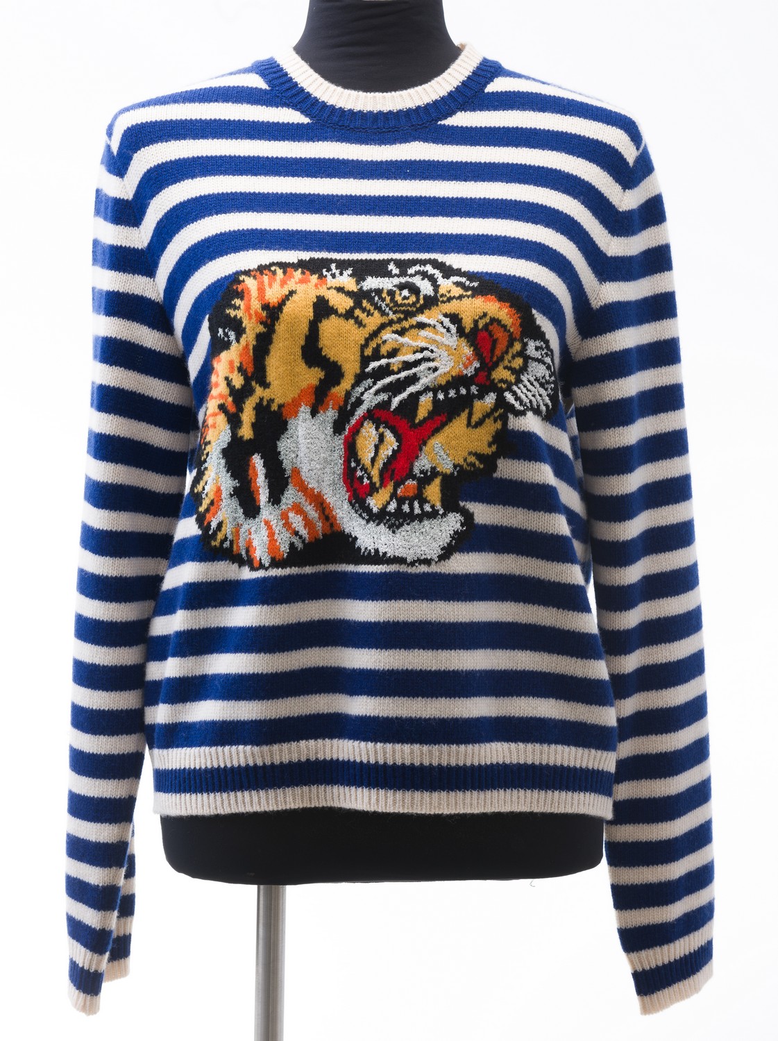 Styled in blue and white striped wool with a tiger motif, labelled size M.