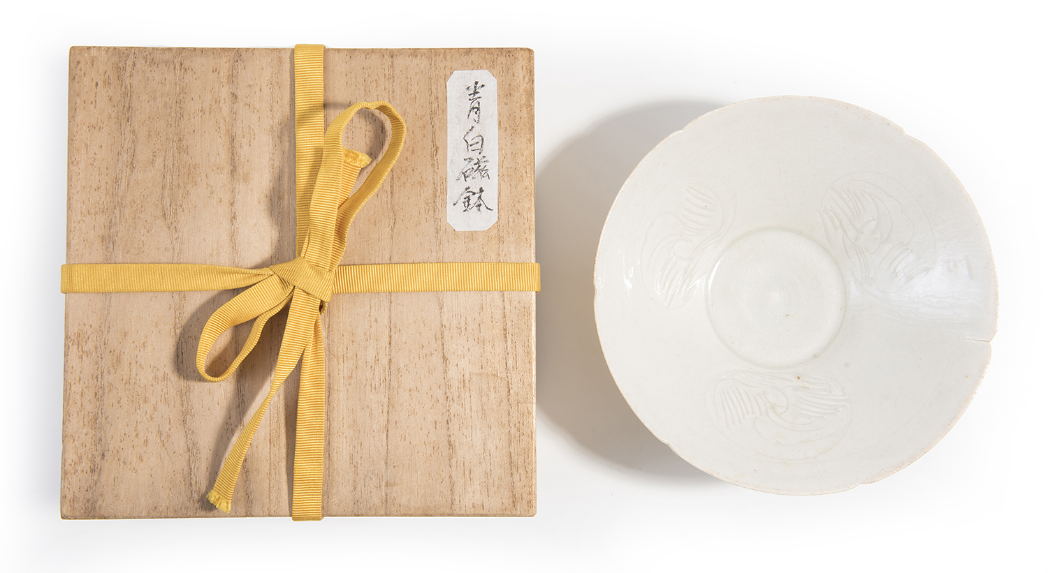 The conical bowl with six notches to the rim, with incised decoration of three roundels of stylised phoenix, covered with a glaze of greyish blue hue. Together with a Japanese wooden box with a paper label.