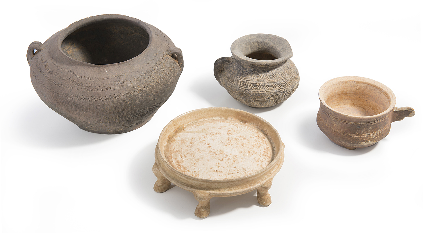 Comprising a jar with two registers of decoration to the shoulder and body including incised and stamped patterns, with two lug handles, and a small jug with stamped decoration around the body, both Spring and Autumn period, a handled footed cup from the Han Dynasty, and a glazed inkstone with six feet dating to the Sui or early Tang Dynasty.