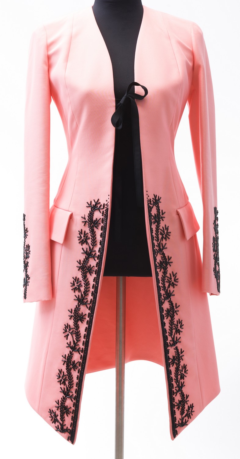 Styled in coral silk blend with black beaded embellishment and black grosgrain bow, size labelled 40.