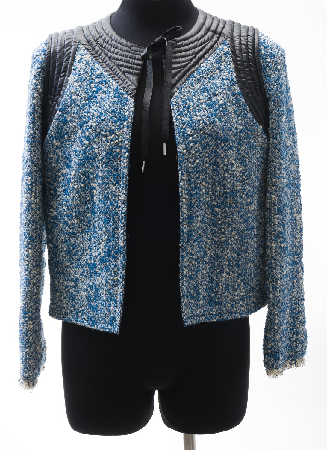 Styled in tweed wool with black leather trim and neck tie, labelled size FR38, original tags attached.