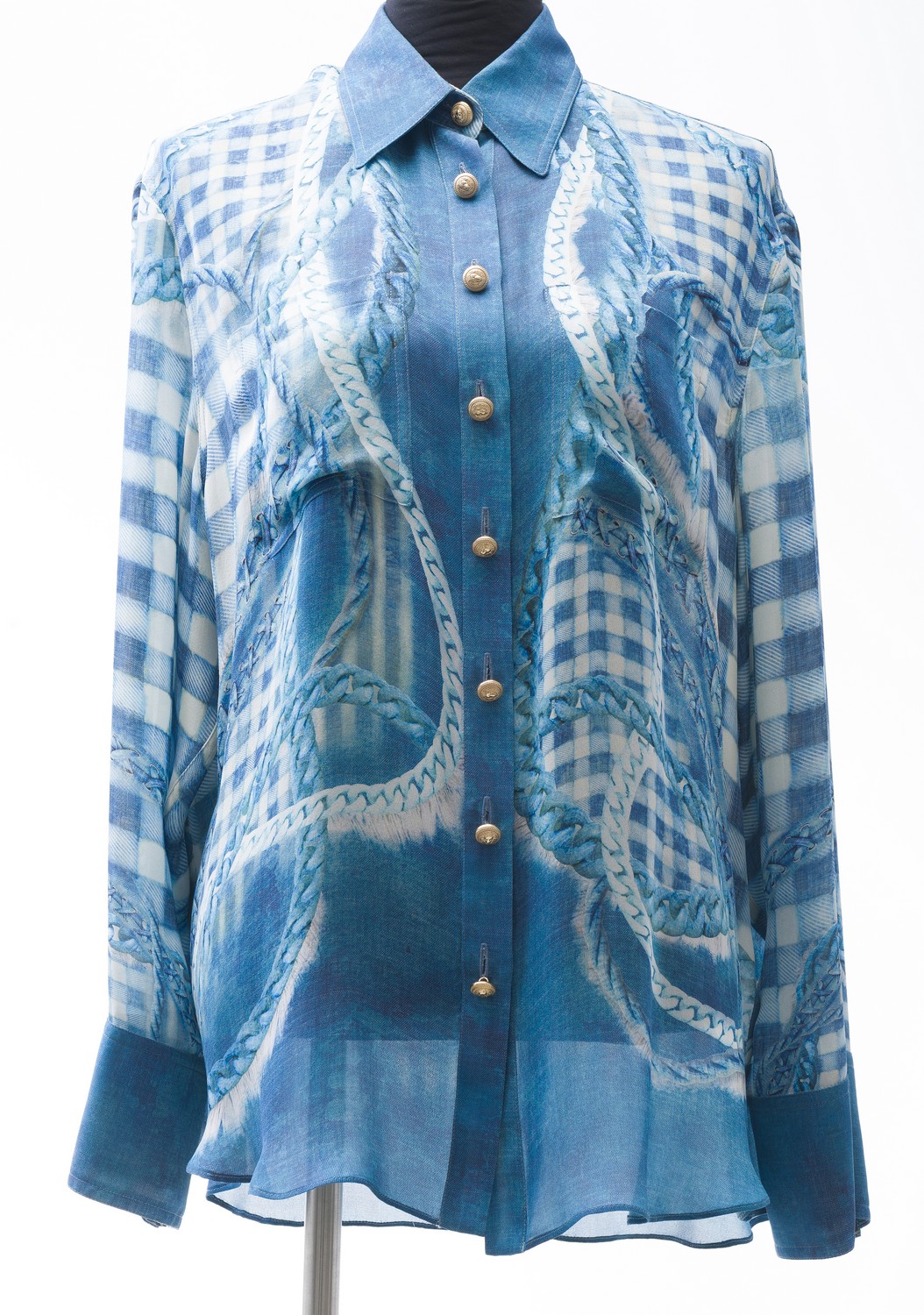 Styled in printed blue silk with gold lion head buttons, labelled size 42.