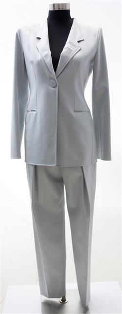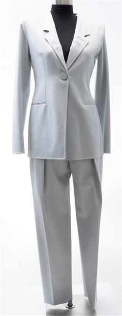 Comprised of trousers and jacket, styled in grey silk blend, both labelled size IT42.
