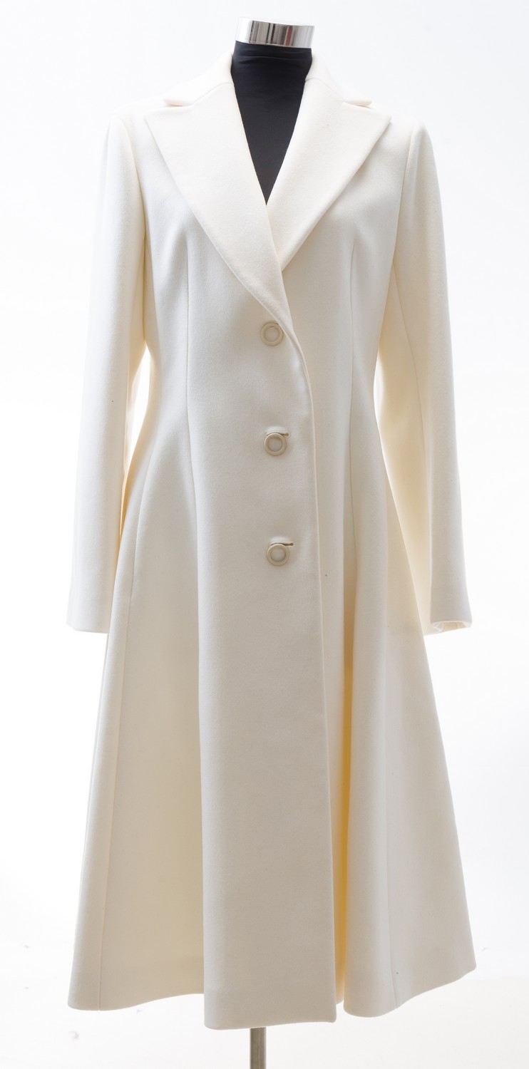 Styled in white wool with feature buttons, labelled size FR42, original tags attached.