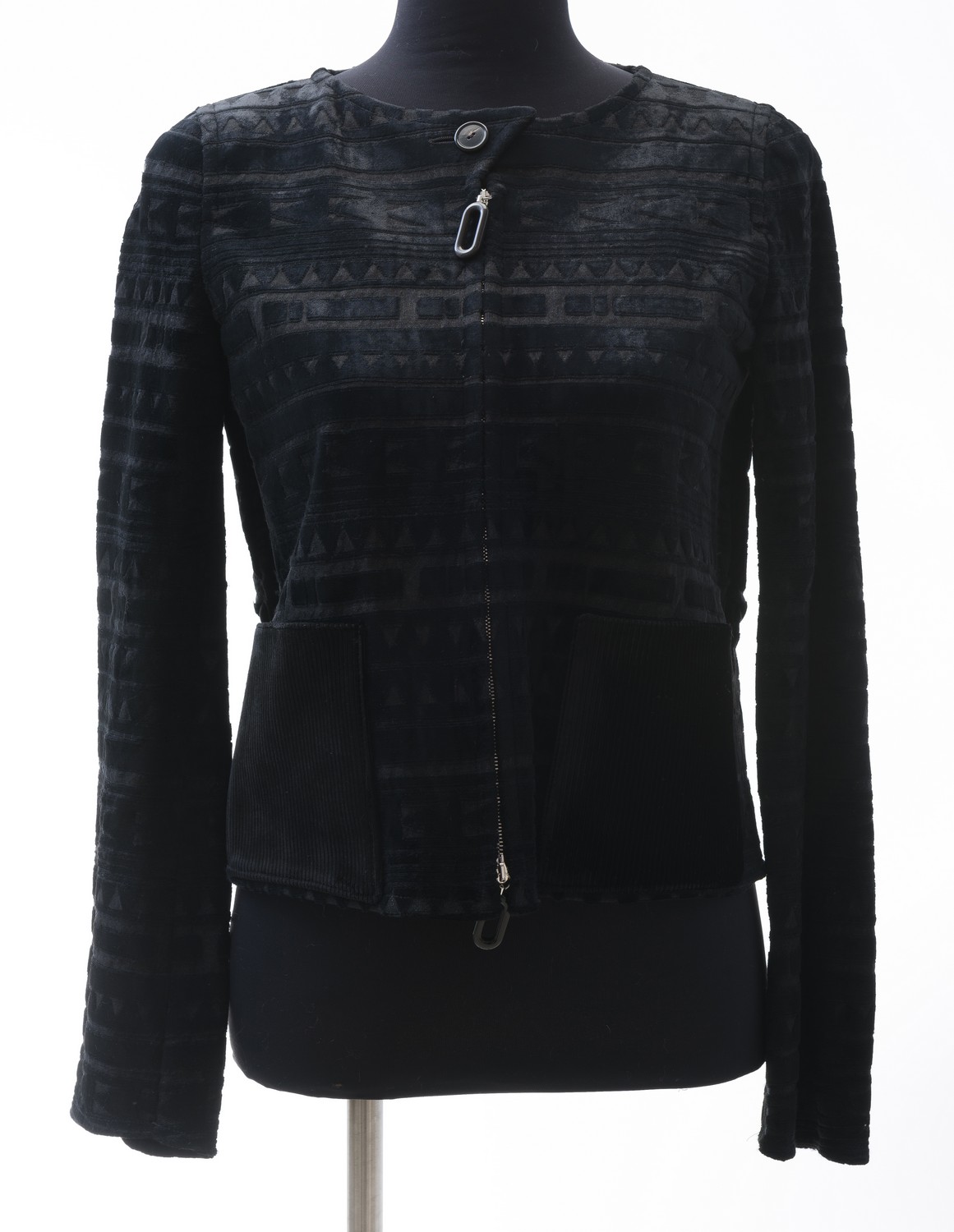 Styled in black flocked velvet with thick velvet pockets, labelled size 42.