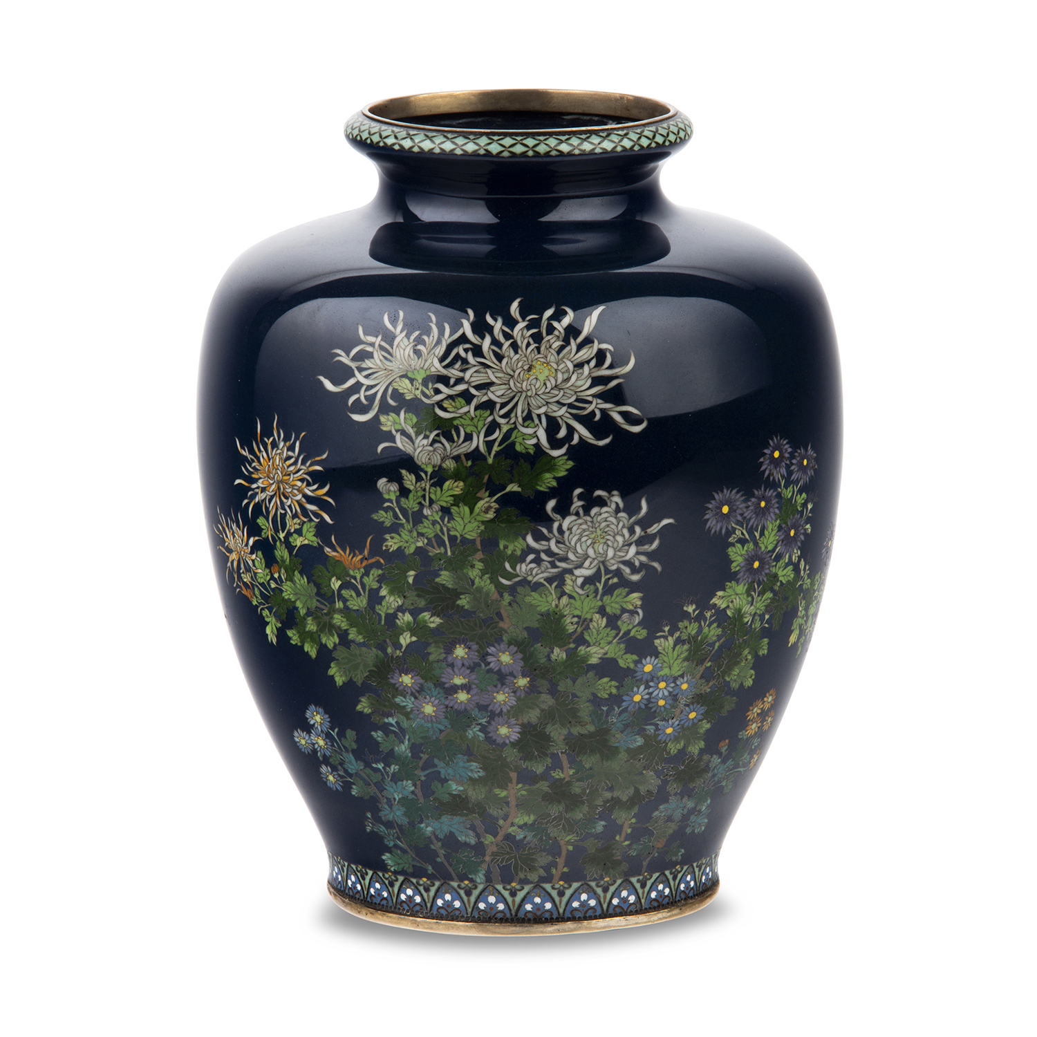 The vase of compressed baluster form with a rounded mouth. Fine silver wire cloisonne decoration of a spray of various chrysanthemum hybrids against a midnight blue ground, with diaper pattern borders to the mouth-rim and foot. Silver collar mounts to the base of the foot and inner mouth-rim. Partially obscured diamond-shaped mark for Hayashi Kodenji to the base
