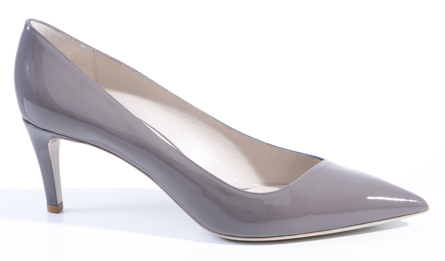 Styled in grey patent leather, labelled size 40.