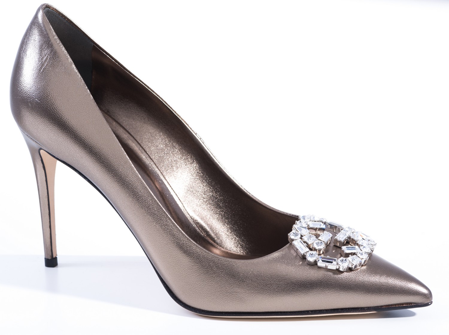 Styled in metallic gold leather with clear stone "GG" monogram embellishment to toe, size 39.