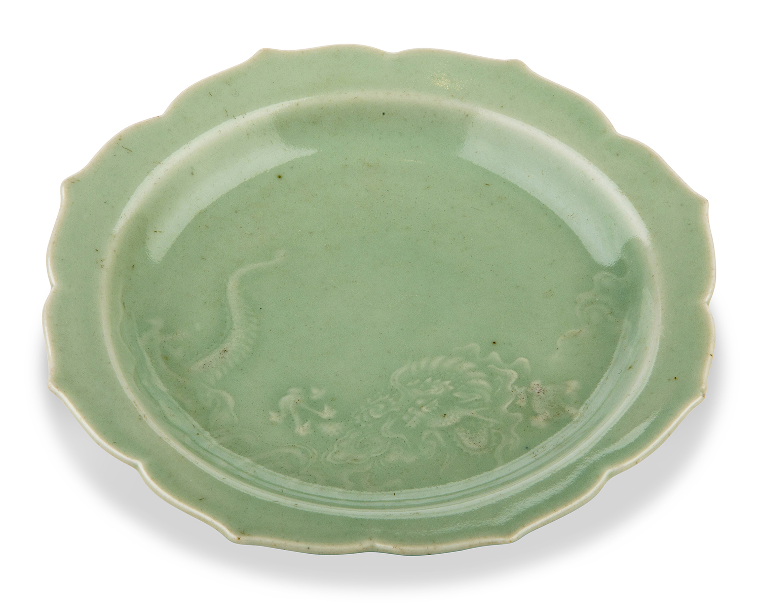 Elegantly molded lobed dish featuring low relief underglaze decoration of a four clawed dragon partially emerging from water.