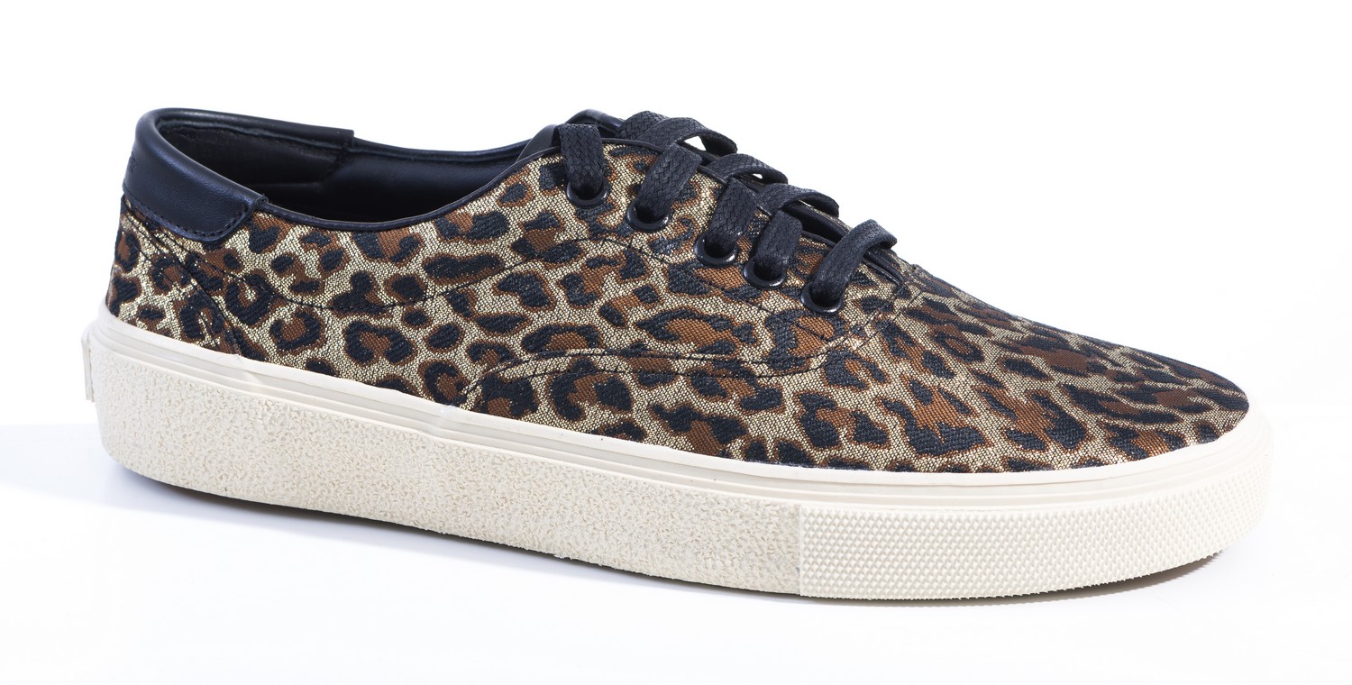 Styled in metallic leopard print fabric with black leather trim, size 40