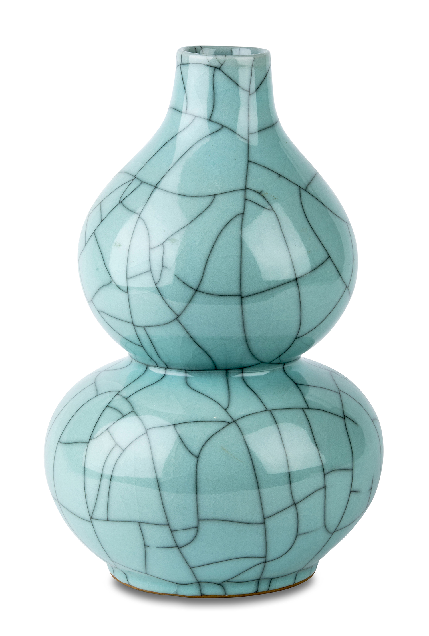 The vase of a pleasing double-gourd form, covered in a pale blue glaze with a broad black-stained crackle, simulating a Song guanyao glaze. Mark to base.