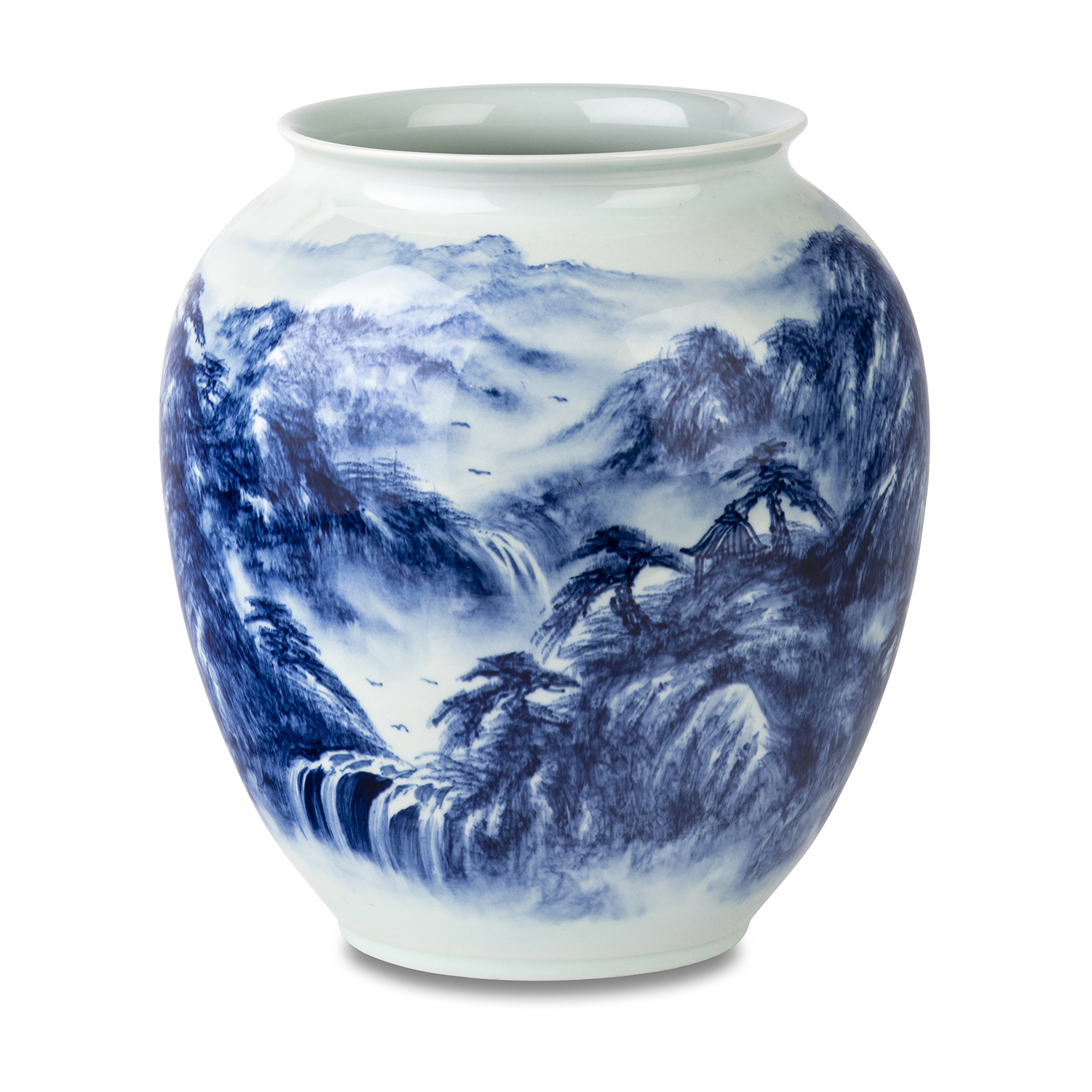 The globular vase decorated in a continuous traditional-style landscape around the body.