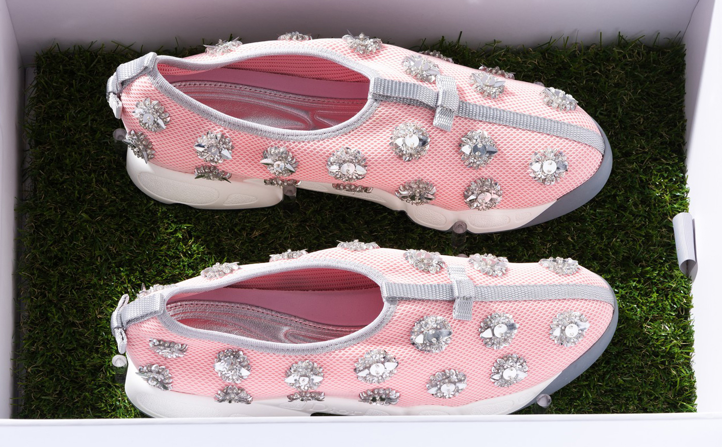 Styled in pink fabric with silver sequins and silver woven nylon trim, labelled size 40.