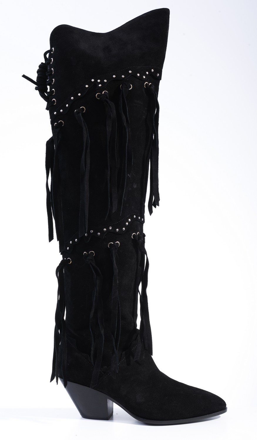 Styled in black suede with fringe detail, size 39.5.