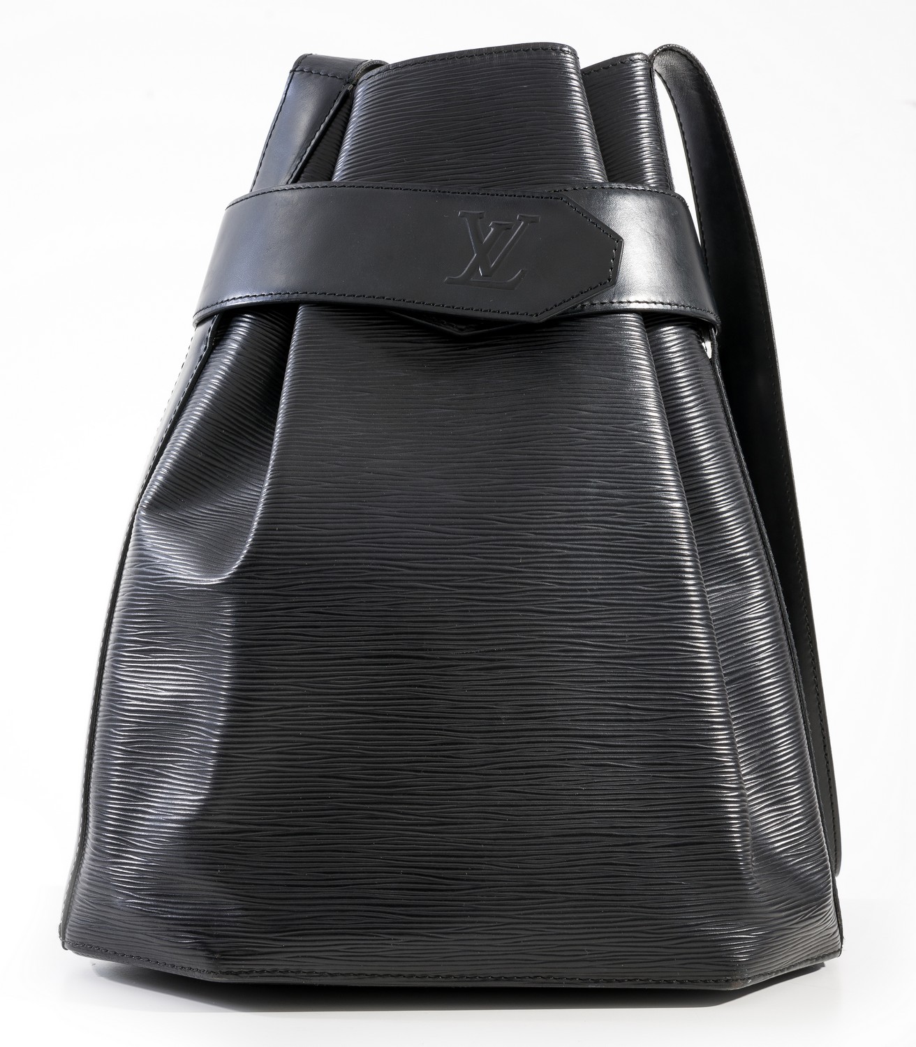 Styled in black Epi leather, 35 x 30 x 40cm.