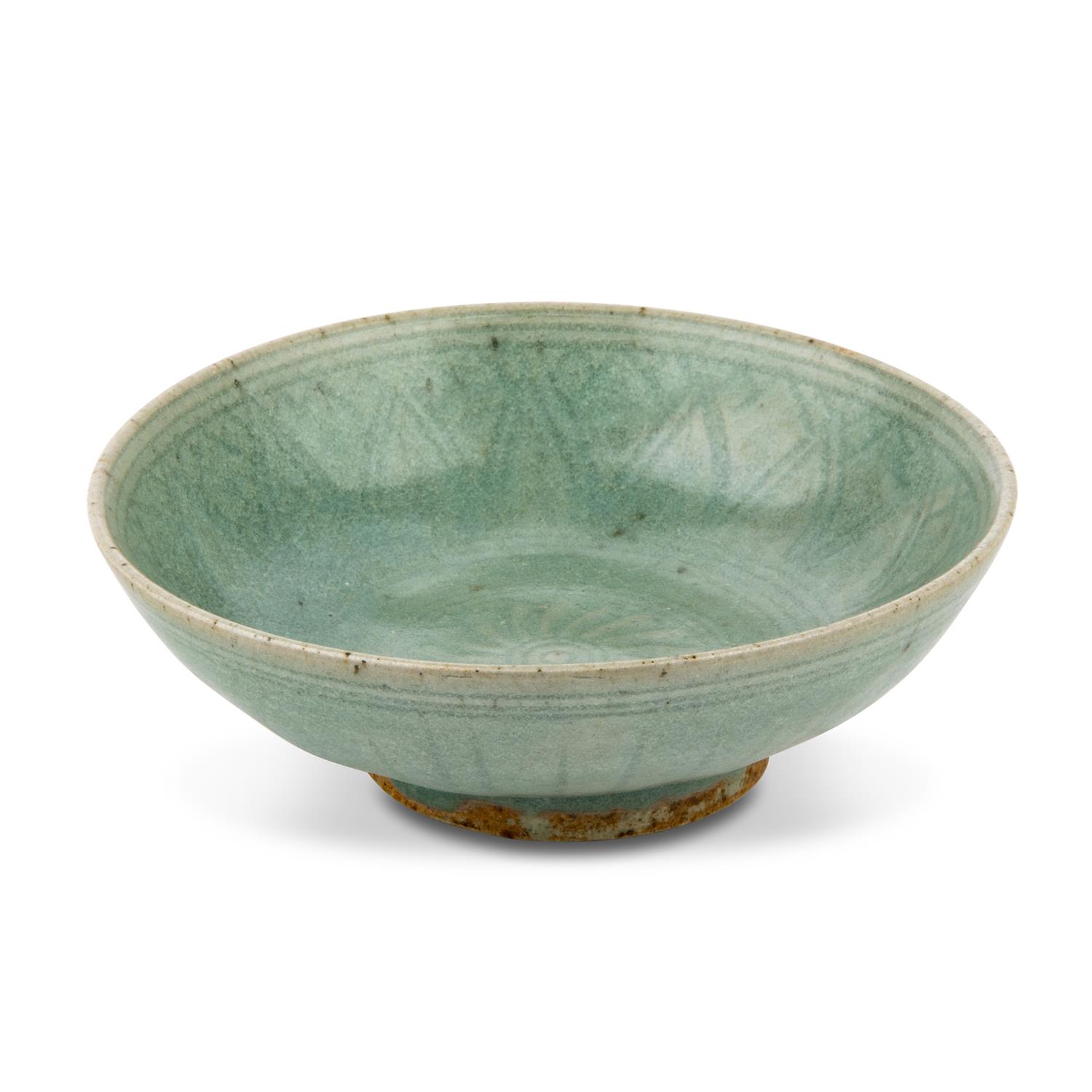 The small dish with incised decoration to the cavetto of lotus petals, with a flower roundel to the interior centre.