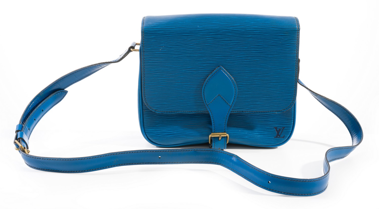 Styled in blue Epi leather with gold metal hardware, 19 x 22 x 8cm.