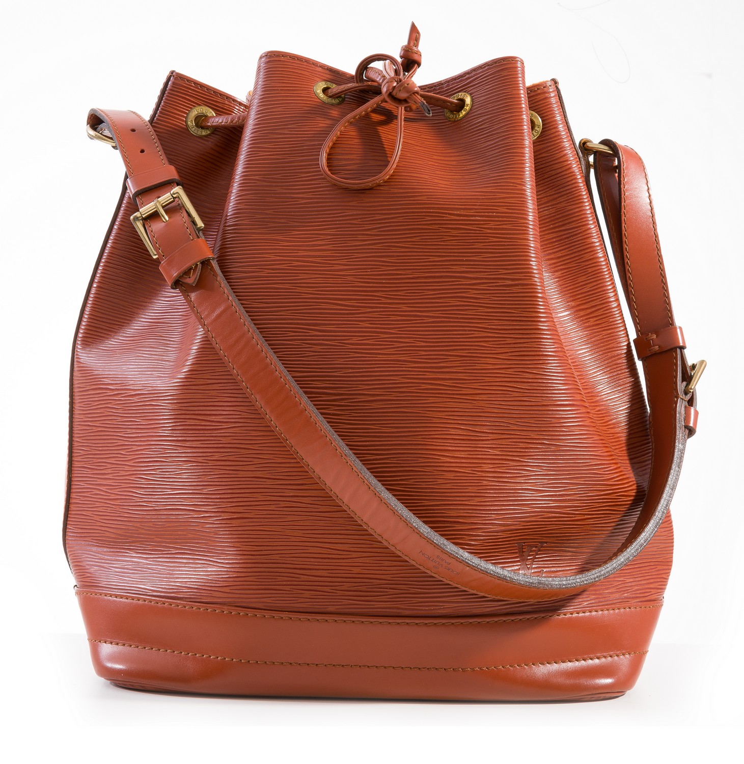Styled in tan leather with brass metal hardware, 32 x 27 x 17cm.
