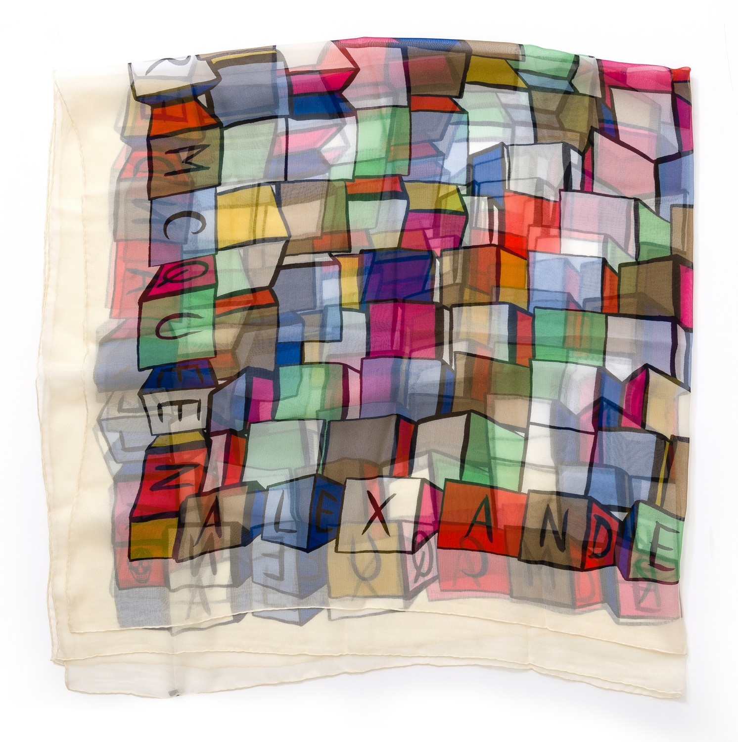 Styled in multicoloured silk, 132cm square.