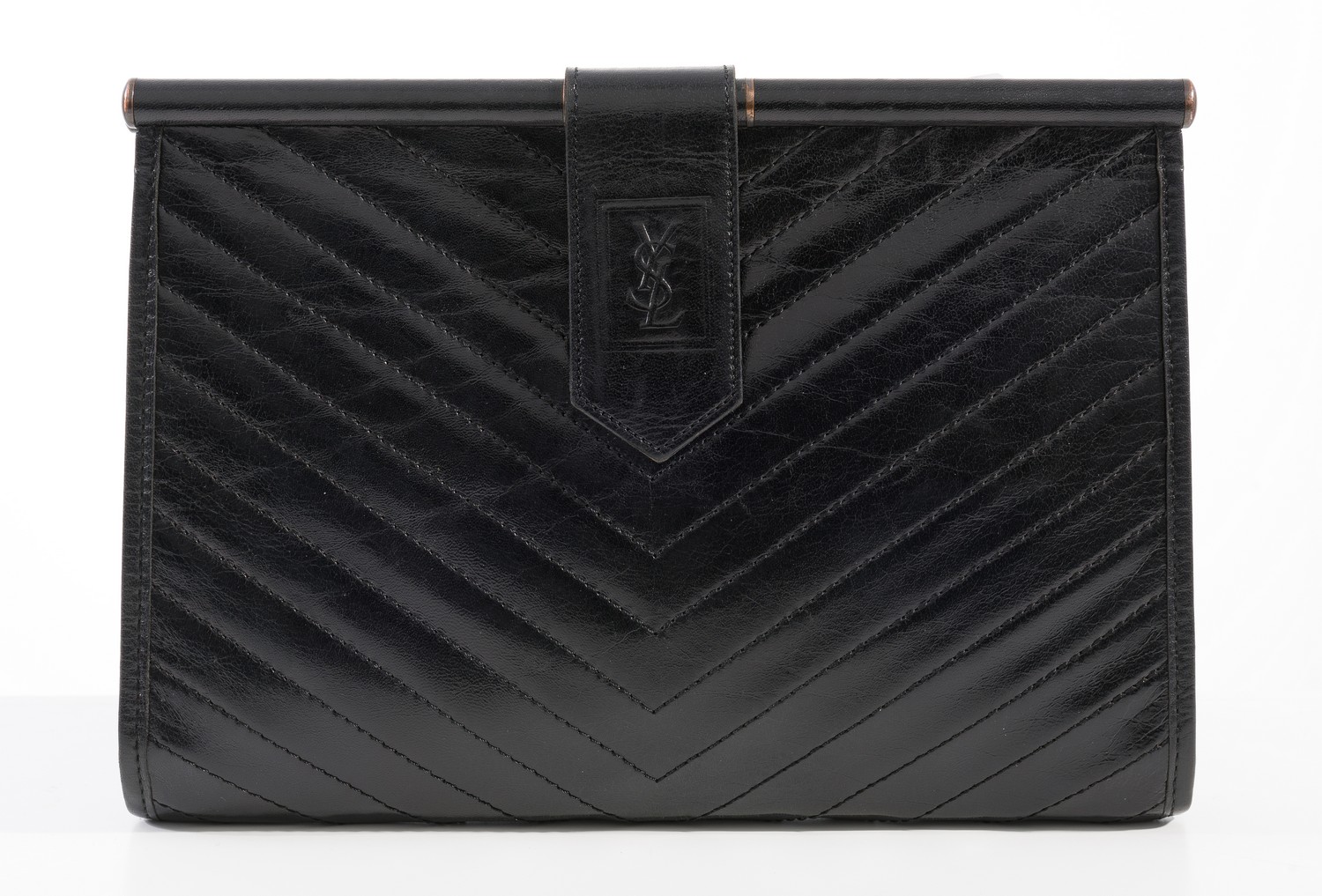 Styled in quilted black leather with brass metal hardware, 19 x 27cm.