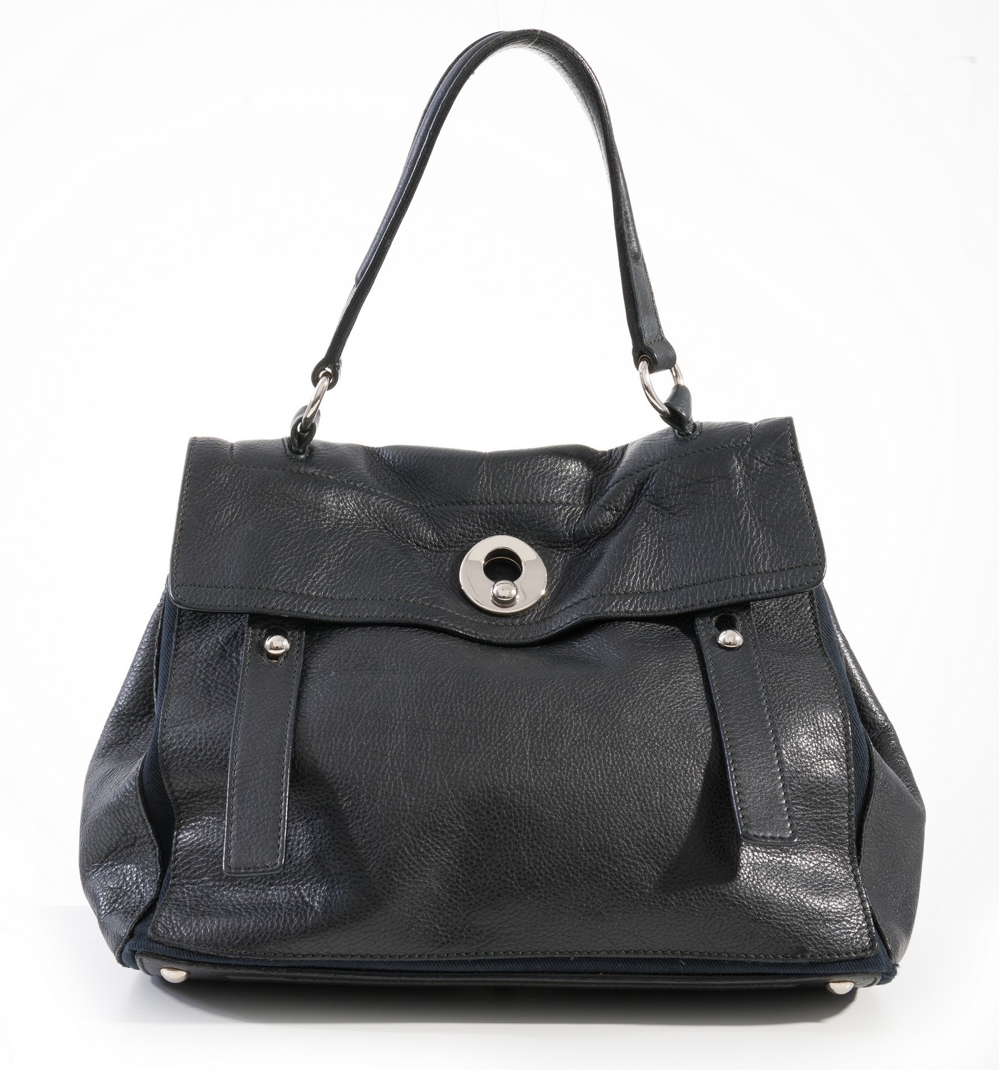 Styled in black leather with black denim trim and silver metal hardware, 24 x 29 x 15cm