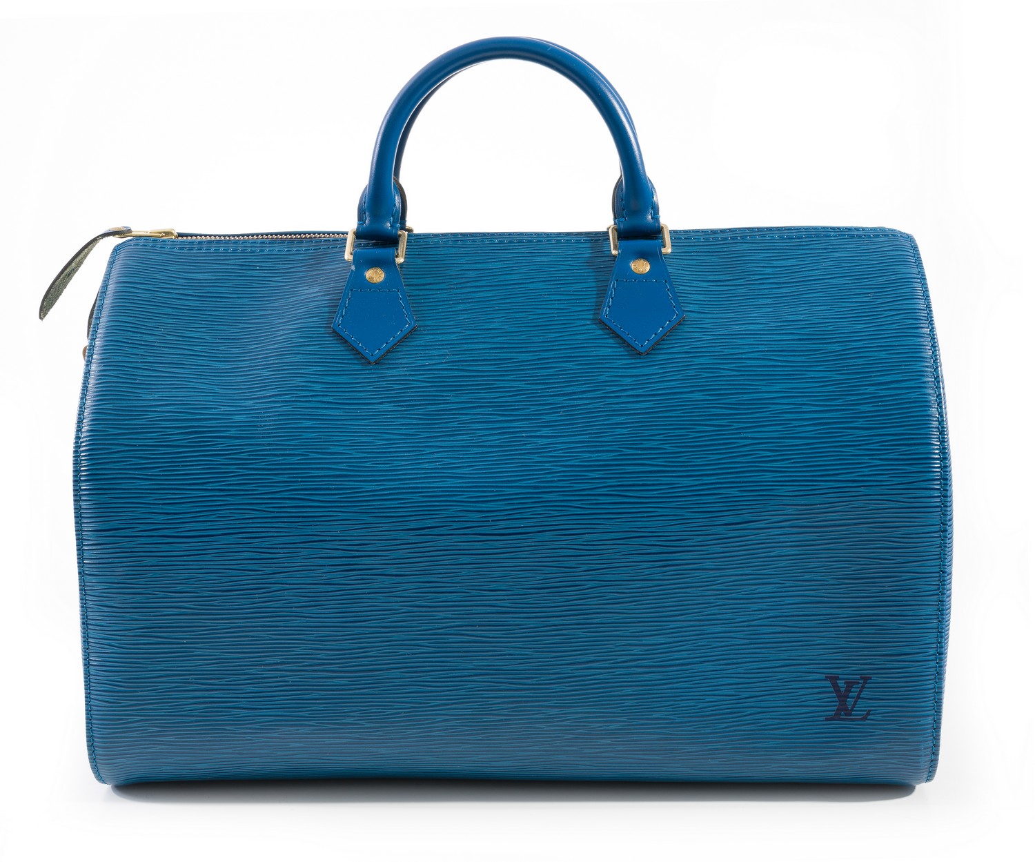 Styled in blue Epi leather with gold metal hardware, 24.5 x 38 x 18cm.