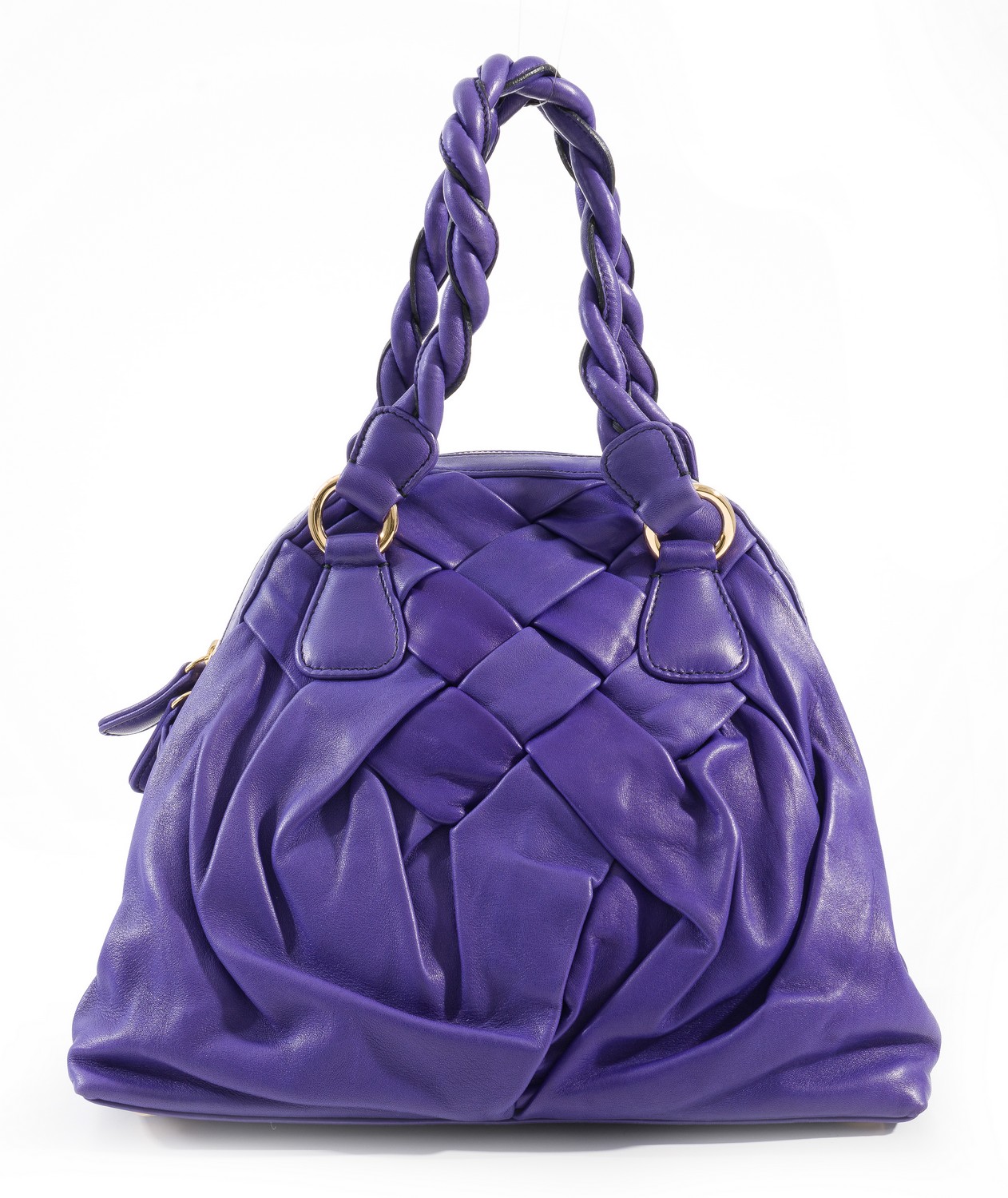 Styled in woven purple leather with gold metal hardware, long strap, 24 x 30 x 12cm.