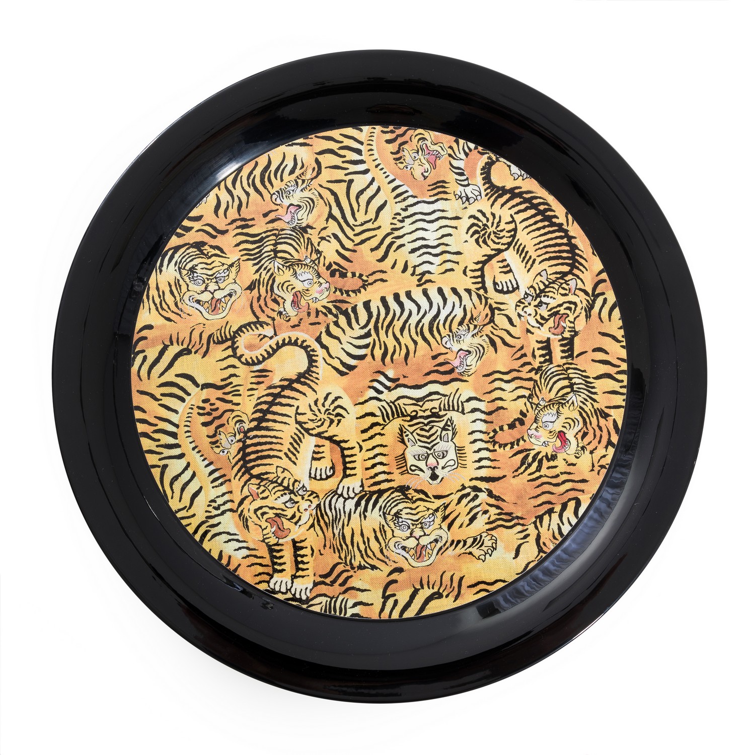 Styled in enamelled metal with tiger motif to a black border, 70cm, boxed.