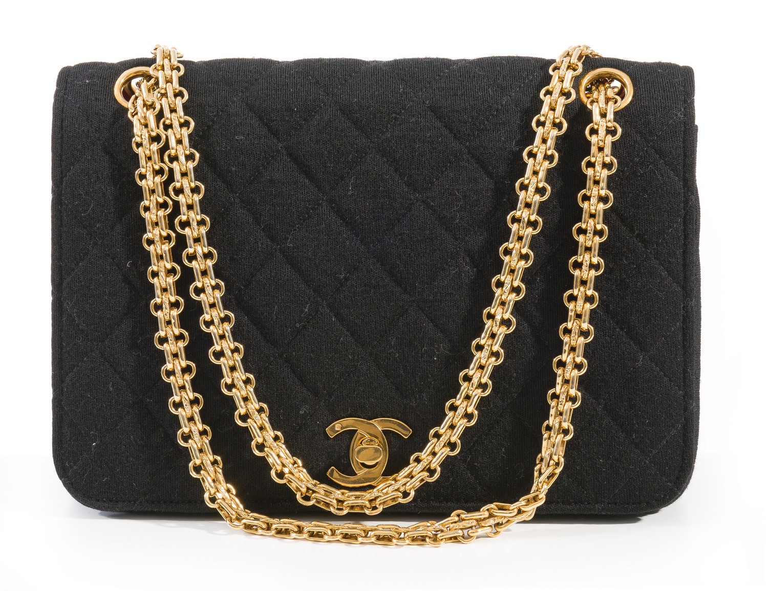 Styled in black cotton with gold metal hardware and chain strap,15 x 23 x 8cm.