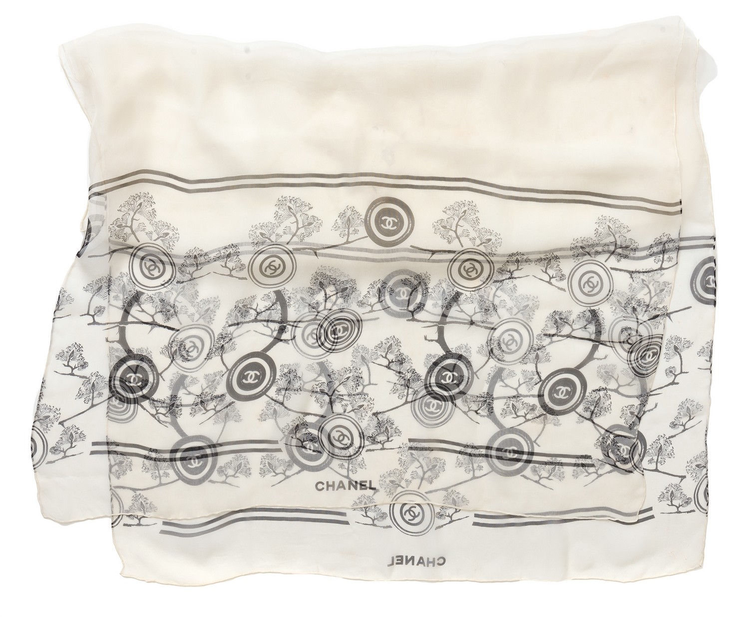 Styled in white silk with black CC and tree motif, 155 x 66cm