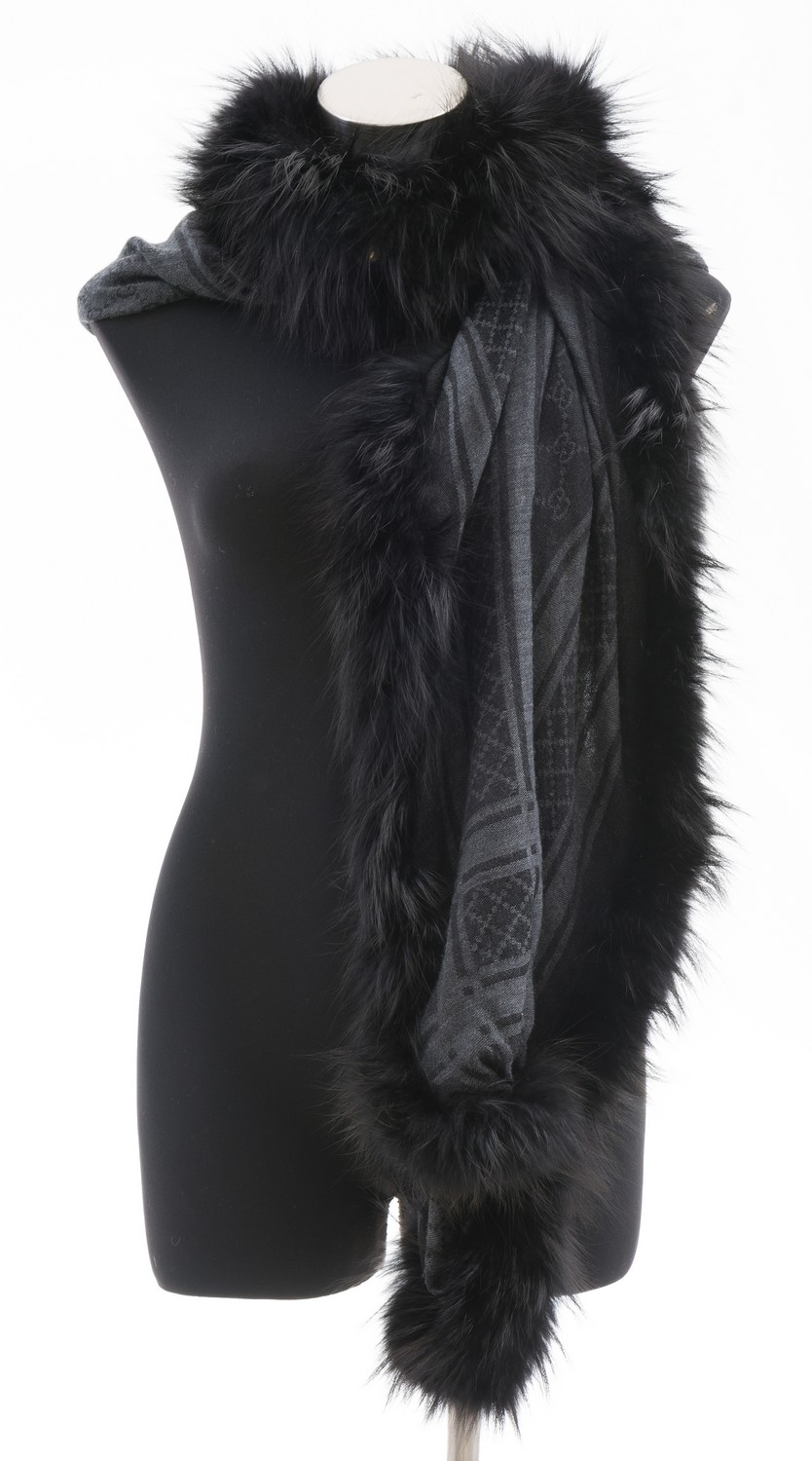 Styled in monogrammed grey and charcoal with black fur edging, length 190cm.