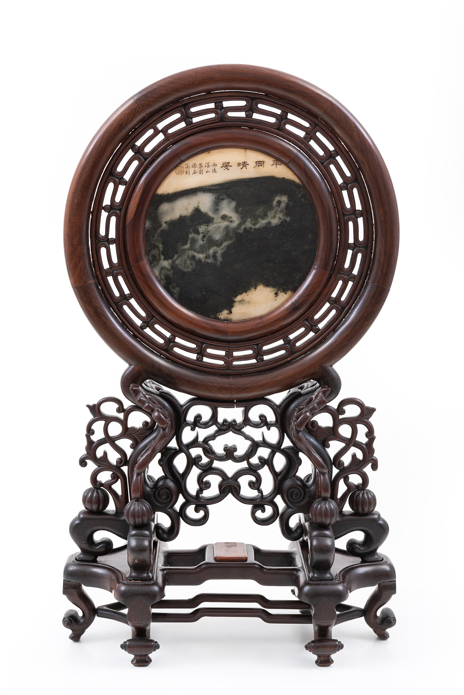 The tablescreen in two sections, the top section with an inscribed circular dreamstone (marble) panel with a fourteen character inscription and seal, set in a carved reticulated hardwood mount, sitting on a carved hardwood stand.