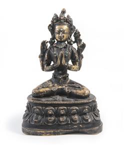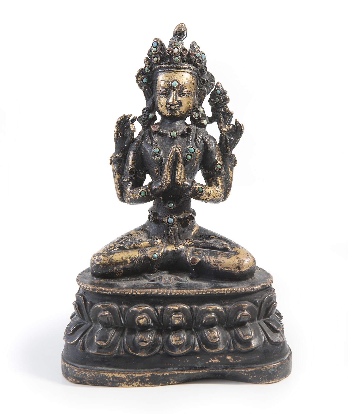 The high copper-content gilt bronze four-armed figure of Avalokiteshvara is seated in padmasana on a double lotus base, with two hands joined in anjali mudra, the other two in vitarka mudra, with a lotus flower emanating from the left hand, the figure crowned and elaborately jewelled with a pearl, turquoise and coloured glass.