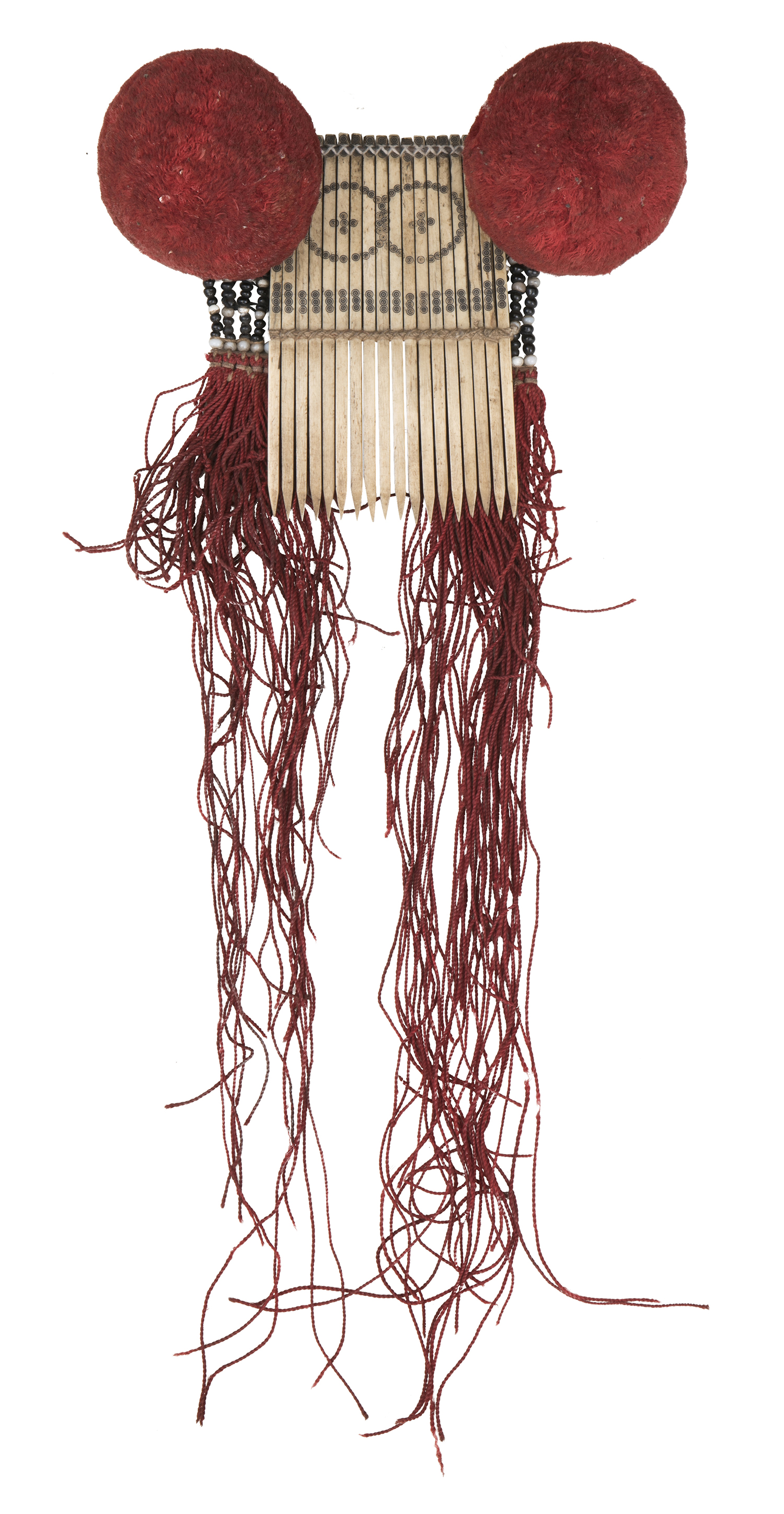 The comb consisting of sharpened lengths of bone held together with twining work, decorated with blackened incised work to the front and rear, red cotton pompoms fixed to the top of the comb, with beaded tassels attached to the pompoms.