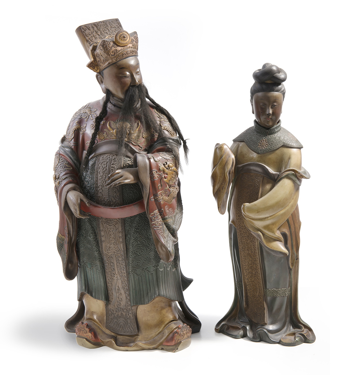 The smaller figure of the lady with a few small areas of loss to the lacquer decoration, including to her raised sleeve, and some of the cloth folds to her garment around the centre. Restoration to either side of the collar around her neck. General wear to the lacquer finish throughout, at the high points. The larger man with a small loss to the lacquer at the rear of his robe. Areas of restoration to the lacquer at the right thumb tip, right sleeve above the hand, and to the right side of his head-dress. The figure missing two objects from either side of the head-dress. Otherwise no further visible faults or damage.